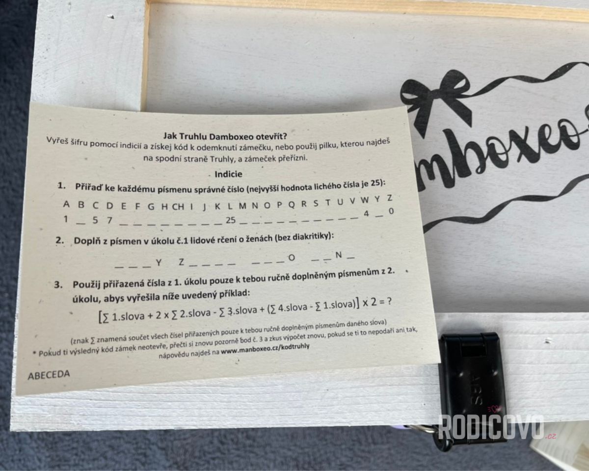 Výhodou je i to, že od Manboxeo dostanete předem do e-mailu správný kód (nebo ho najdete na jejich webu), kdyby byla šifra přece jen příliš těžká. A pokud si nechcete nechat zámeček, můžete ho přeříznout přiloženou pilkou. Takže žádný stres, jen zábava a radost z překvapení.