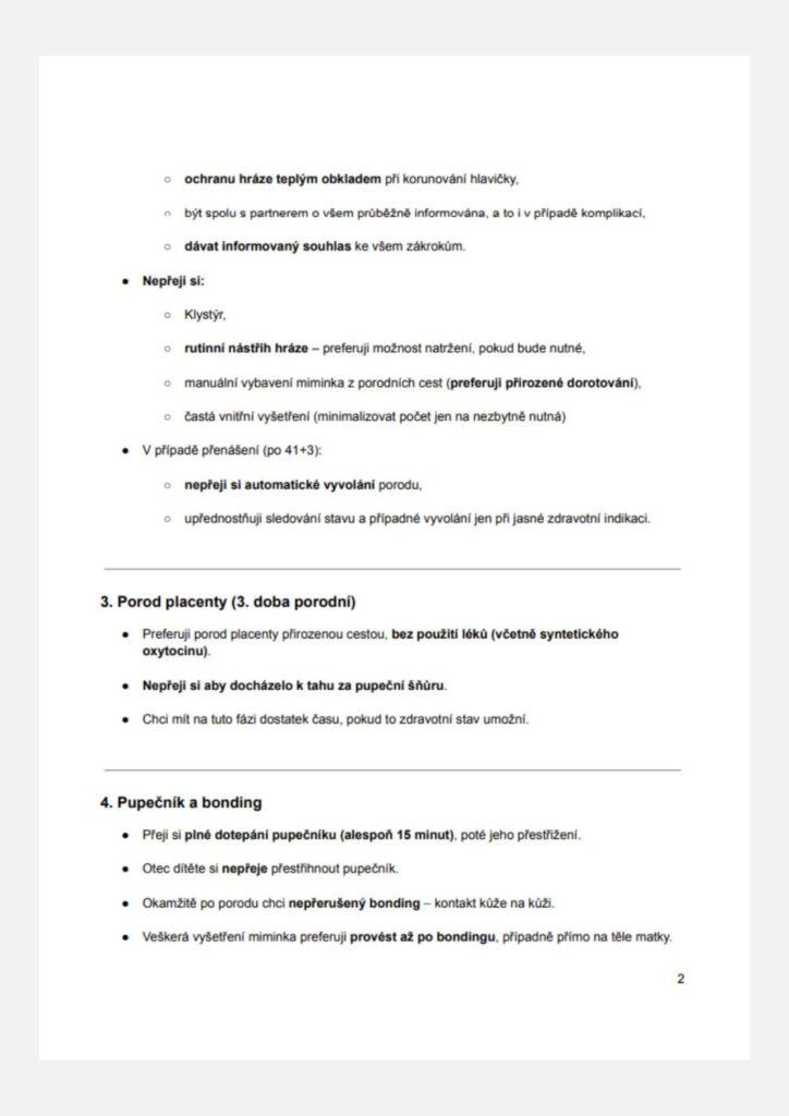 Pojďme si projít jednotlivé body našeho vzorového porodního přání a vysvětlit si, co přesně znamenají a jaké máte možnosti: